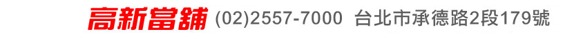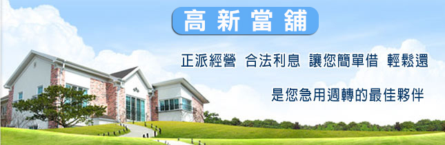 在你急須週轉的關鍵時刻本公司提供汽機車借款、工商融資.各種長短期週轉服務,完全按照政府明訂法規為準,利息則依照當舖營業法相關法律規定計算,絕非地下錢莊高利息,當然也不會有違法的暴力討債。有資金上的問題,竭誠歡迎您親臨本公司或來電洽詢, 高新當舖專業經營,秉持熱誠服務手續簡便、放款快速,誠信安全,息低保密,透明化借貸流程讓您好放心。